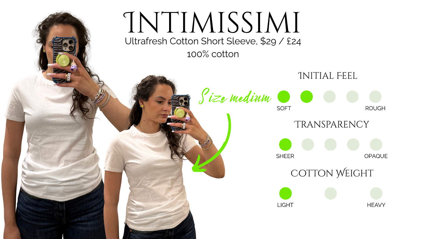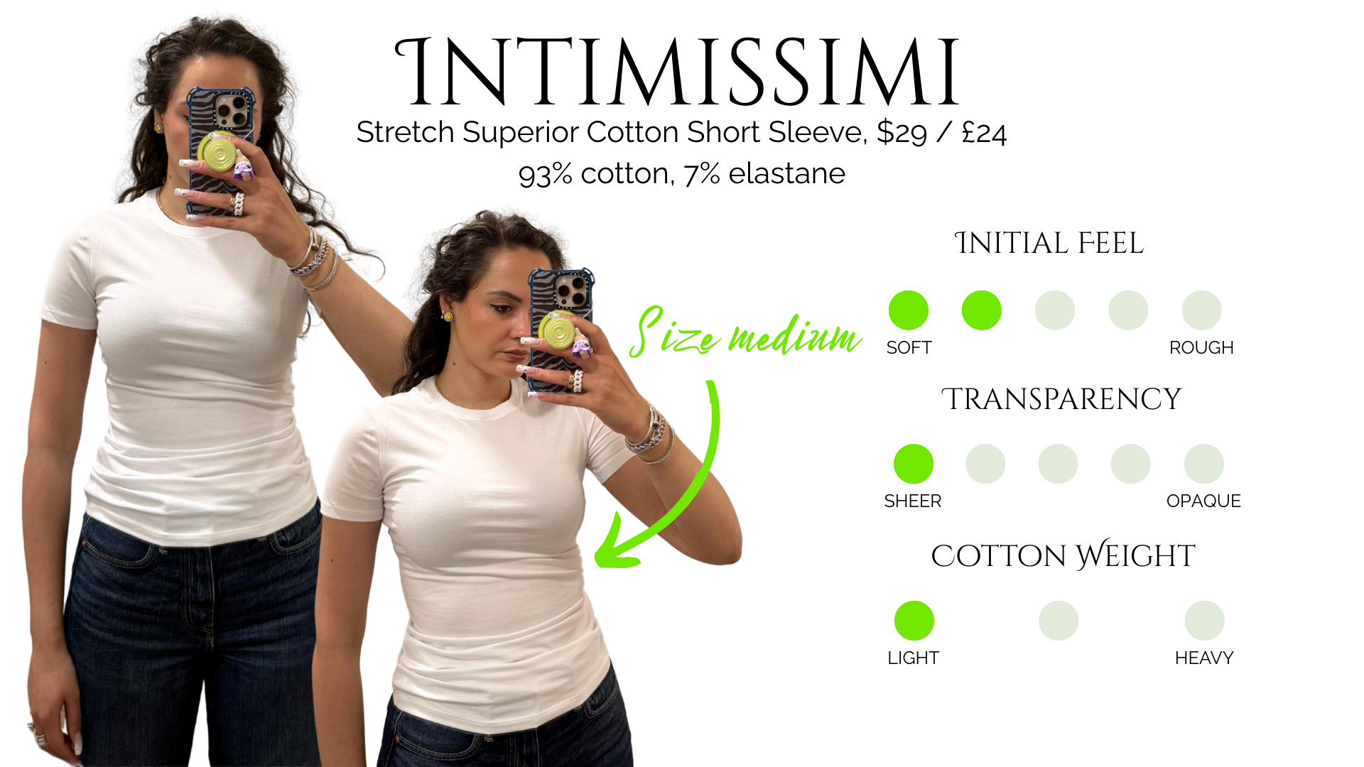 The sizing on this tee definitely leans towards the smaller side, and both Intimissimi tees on this list are cut longer. This would be great if you have a longer torso/want to avoid a baby tee, or want a good layerer (especially since this is pretty sheer) .